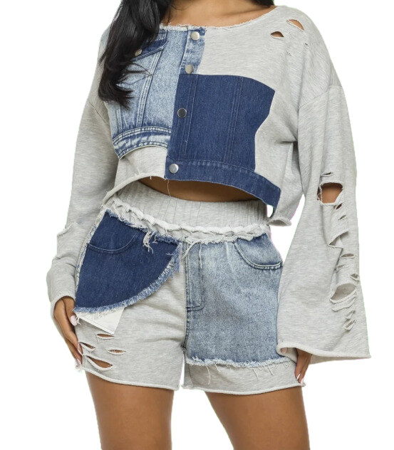 This Going out matching set is giving cozy meets cool with a serious dose of street style. The edgy mix of denim and soft fleece gives you the best of both worlds — comfy enough for errands, bold enough for a cute brunch fit. The cropped top features distressed details and raw edges, while the matching high-waisted shorts bring those baddie off-duty vibes.