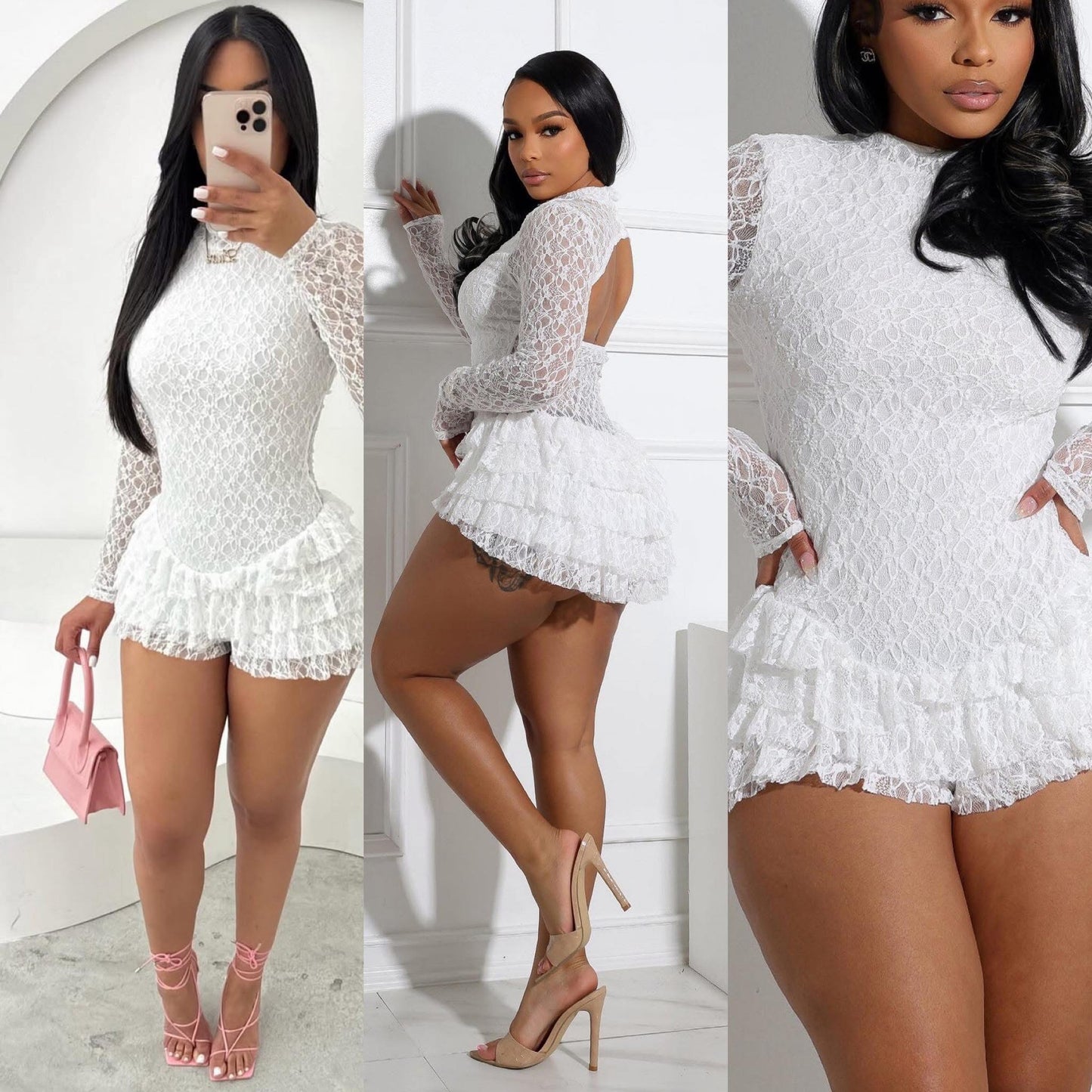 Meet the holiday romper that always gets a second look. This white lace ruffle romper is designed with long sheer sleeves, a fitted bodice, and layered ruffle shorts that create a soft, feminine silhouette. The open-back detail adds a subtle touch of drama while keeping the style elegant and clean. This ruffle romper is the perfect piece for all-white parties, birthday outfits, holiday events, nights out, or any moment when you want something classy but playful.