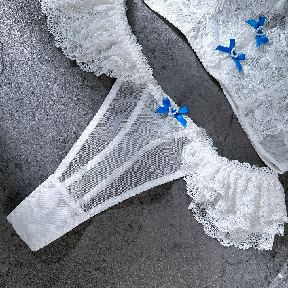 Embrace elegance and femininity with the Lily Grace Lingerie Set, a delicate combination of luxurious lace and soft satin ribbons. This stunning white set features intricate lace with a soft, romantic finish, adorned with beautiful blue satin bows. The design includes a charming ruffled trim, adding an extra touch of playfulness and elegance. The bra is designed with gentle lace cups, while the thong completes the look with its matching ruffled details.