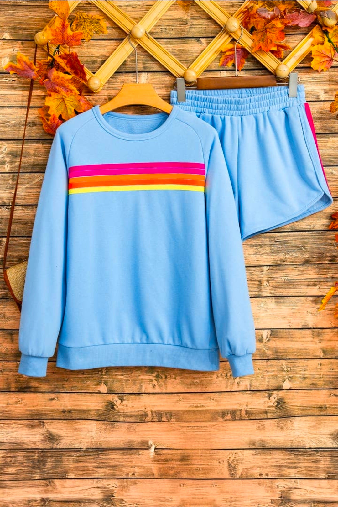 Bring the sunshine with this casual two-piece lounge set featuring a bold colorblock stripe that adds instant personality to your everyday fit. The soft blend of 50% cotton and 50% polyester feels like a cozy hug while keeping you light and breathable. Perfect for lounging, errands, or brunch with your besties — this pullover and shorts combo gives off effortless “I woke up cute” energy.