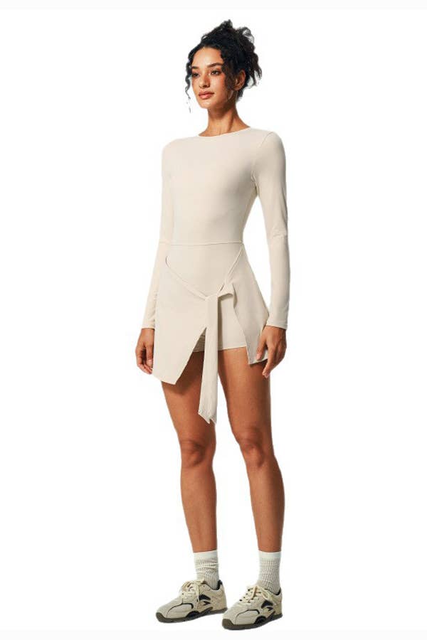 Professional active wear tennis or golf outfit. Longsleeve romper style set wit h covered skorts. Premium yoga fabric. Under shorts with right side one pocket. Work out or just casual wear. Front belt tie make dress more fancy. 82% poly 18% spandex. Import..